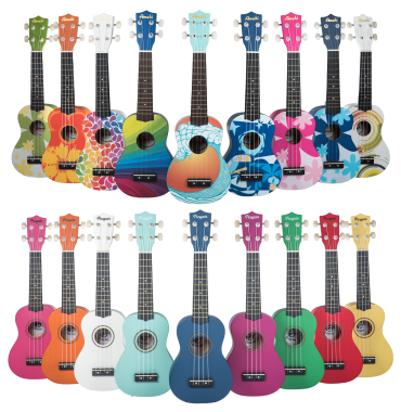 Diamond Head soprano ukuleles are available in a rainbow of colors as seen above. These inexpensive options ($34.95 on sale) feature fully geared tuning machines and include a matching colored carrying bag.